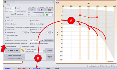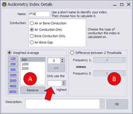 Then you choose whether to calculate the index as an average of thresholds (A) or a difference between two thresholds (B). The latter may be interesting, for instance, to calculate a difference between the threshold at 500 Hz and 2000 Hz. If positive, this may be indicative of hydrops; if negative it may be indicative of presbycusis. For (A), enter the different thresholds and Audiqueen will calculate the average. You may also decide to only use the X highest values (arrow). For instance, if you enter 250, 500, 1000, 2000, and 4000 Hz as the basis for the index and then select ‘only use the 3 highest’, Audiqueen will take the three worst points out of 5 and it will calculate the average of those 3 points.