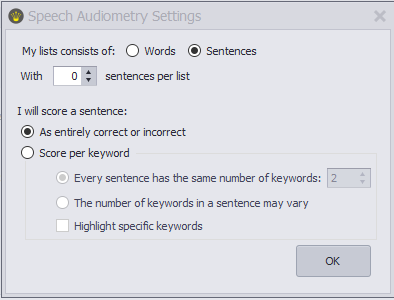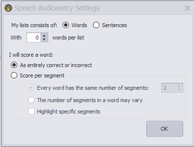 If you choose segment scoring, you must specify whether each item has a fixed number of segments or not. If not, you will need to select the segments to be scored for each item later on. You can also specify whether the relevant segments should be highlighted during the test. This allows the audiologist to see which segments are involved.
