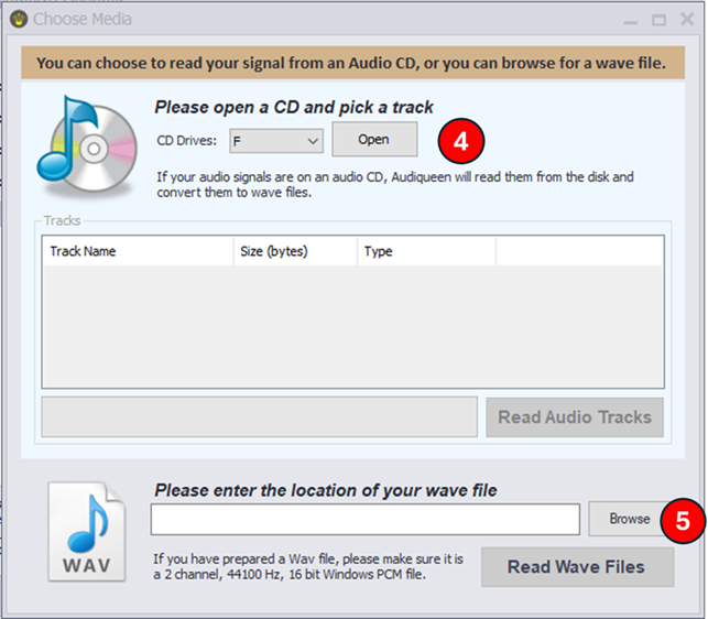 (4) for audio files on CD: locate the audio tracks; (5) for WAV files: locate the files on your PC | You can now select the file containing the first list of words or phrases. |