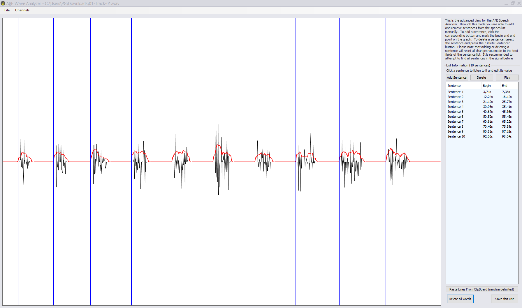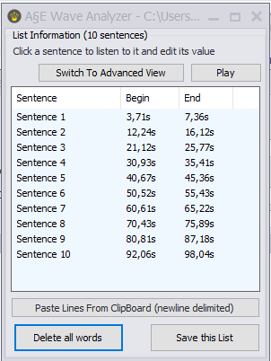 ![]() | Audiqueen analyses the file and attempts to identify the correct number of items. These are then displayed. You can change the name of an item by double-clicking on it. If you have the list of names in MS Word, you can copy it using Ctrl+C and paste it here as a whole list. If Audiqueen is unable to recognise the correct number of items, the wave analyser will open, allowing you to manually mark the items.