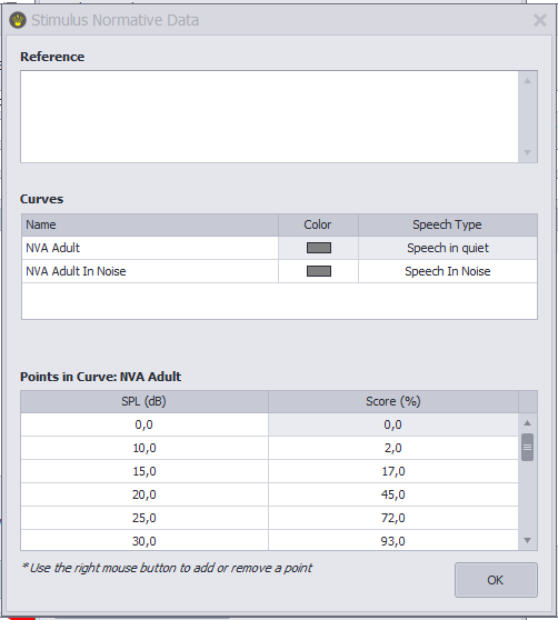 ![]() | Click on ‘Normative Data’ to enter the normal curves for quiet and noisy conditions. These will then be displayed automatically on the speech audiogram. ![]() See also this support page. |