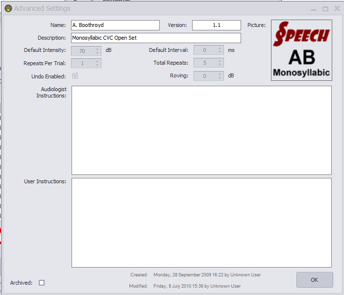 ![]() | Use the More Settings button to change a number of settings, add an icon to the test, add instructions for the audiologist or the user, or to archive the test. |
