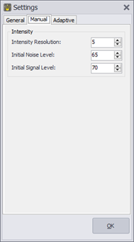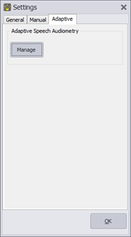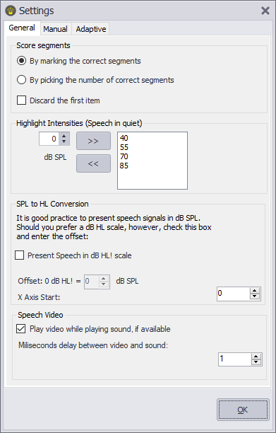 Here you can choose how to score the segments, whether to highlight one or more intensities, whether to convert the SPL axis to HL, and whether to play video segments. | Here you can set the intensity resolution and the initial levels for the signal and the noise. | Here you can manage the adaptive methods. See Adaptive method for details. |