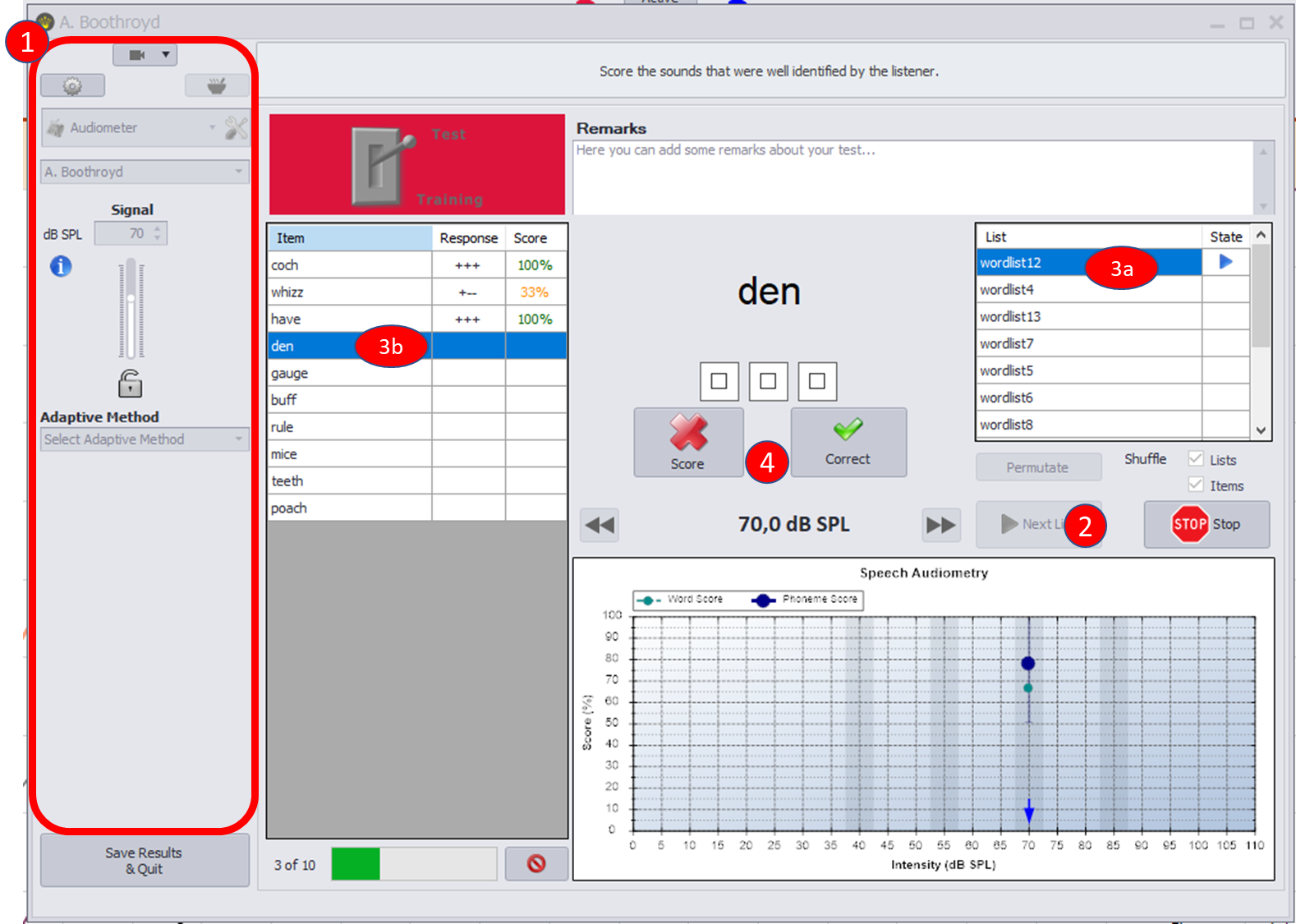 Set the test parameters (1), such as the speech list, and the presentation level of the signal and the noise (if relevant).
