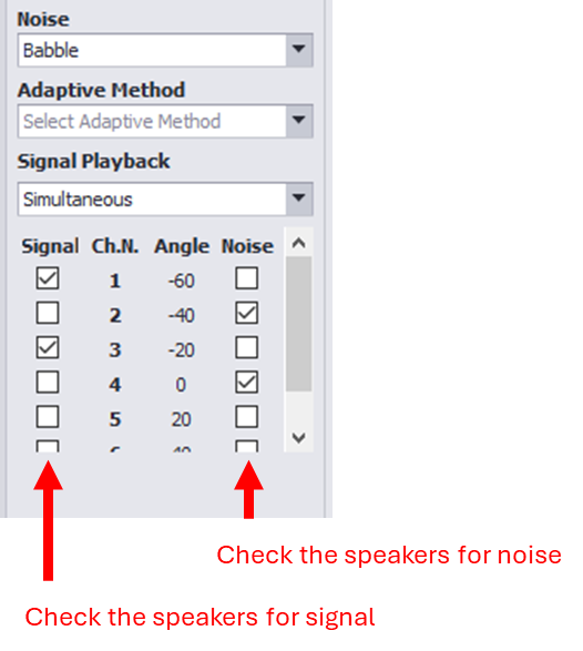 If the soundcard is set to be used with more than 2 speakers (SoundC), you can set through which speakers sound should be played to present the stimulus signals and noise.