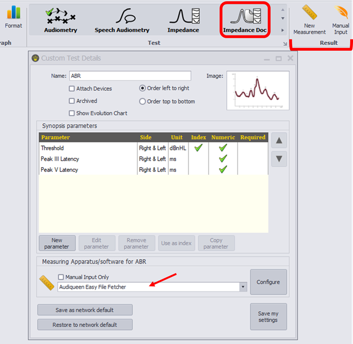 Impedance measurements are performed using a tympanometer and the results are imported into Audiqueen (see this support page for details).