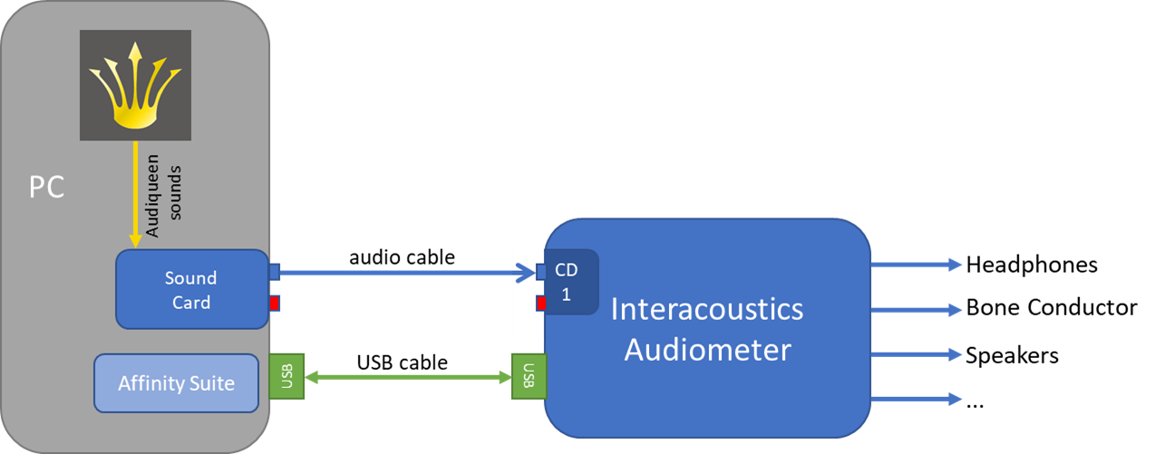 Connect your PC's soundcard with an audio cable to the CD 1 (or CD2) input of the audiometer