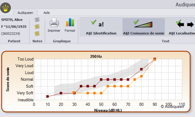 The loudness scaling test uses narrow band noises centred at 250, 1000 and 4000 Hz presented at different levels. The results provide useful feed-back for the programming of the hearing device (hearing aid or cochlear implant).