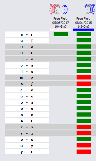 A§E phoneme discrimination test results. Each column represents a different test session with its own date and configuration of the hearing aids.